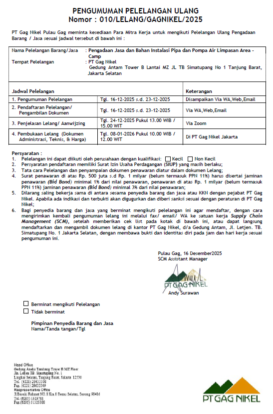 Pembukaan Lelang (Dokumen Administrasi, Teknis, & Harga): Tgl. 22-12-2025 Jam 10.00 WIB/12.00 WIT (Kantor Pusat Jakarta PT Gag Nikel)